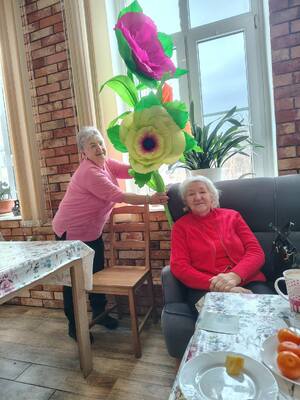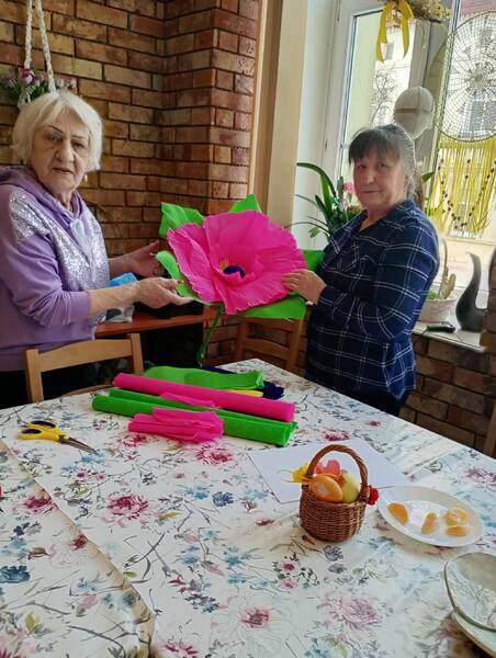 Dużym zainteresowaniem cieszą się także zajęcia arteterapii oraz warsztaty ceramiczne. Pod okiem instruktora Seniorzy tworzą urocze, gliniane „kurki”, które stają się wyjątkowymi pamiątkami. Praca z gliną pozwala na wyciszenie, rozwija wyobraźnię i wspiera sprawność manualną. To również czas rozmów, integracji i wspólnego przeżywania radości z efektów własnej pracy. Podczas ostatnich zajęć artystycznych Seniorki zamieniły papier w kolorowe, gigantyczne kwiaty. Tworzenie takich dekoracji to nie tylko ćwiczenie sprawności rąk, ale także przestrzeń na wspomnienia, uśmiech i budowanie relacji.