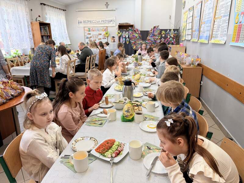 Równie radosna i świąteczna atmosfera towarzyszyła Śniadaniu Wielkanocnemu zorganizowanemu w świetlicy „Bezpieczna Przystań". Był to wyjątkowy czas pełen uśmiechu, życzliwości oraz wspólnego celebrowania tradycji. Pięknie udekorowany stół, tradycyjne potrawy oraz obecność symbolicznego zajączka sprawiły najmłodszym wiele radości. Spotkanie stało się okazją do zatrzymania się na chwilę, by pobyć razem i poczuć magię świąt.